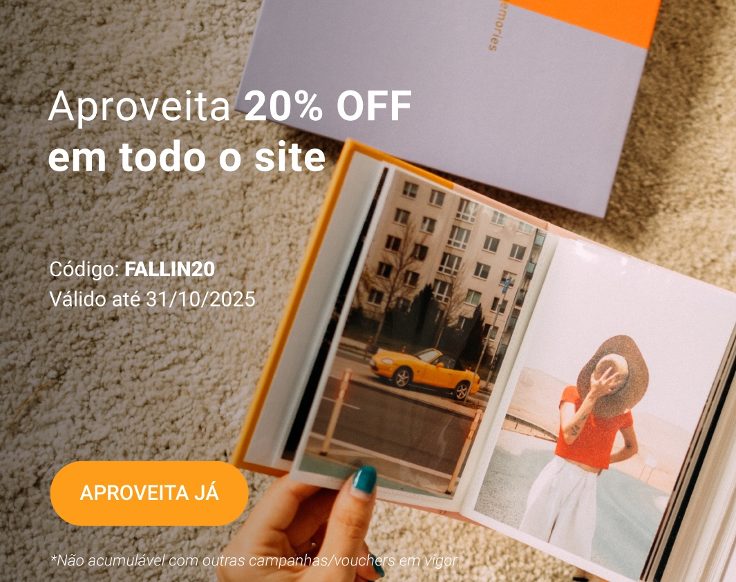 Campanha válida exclusivamente em vouchers de Álbuns de Fotos. Caso pretendas aproveitar a campanha mais do que uma vez, deves fazer as encomendas separadamente.